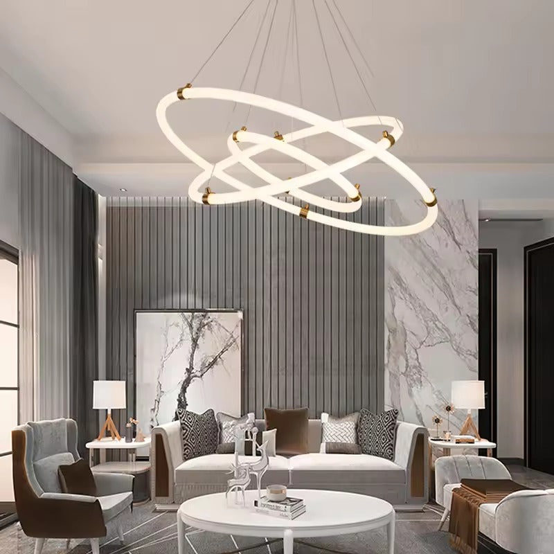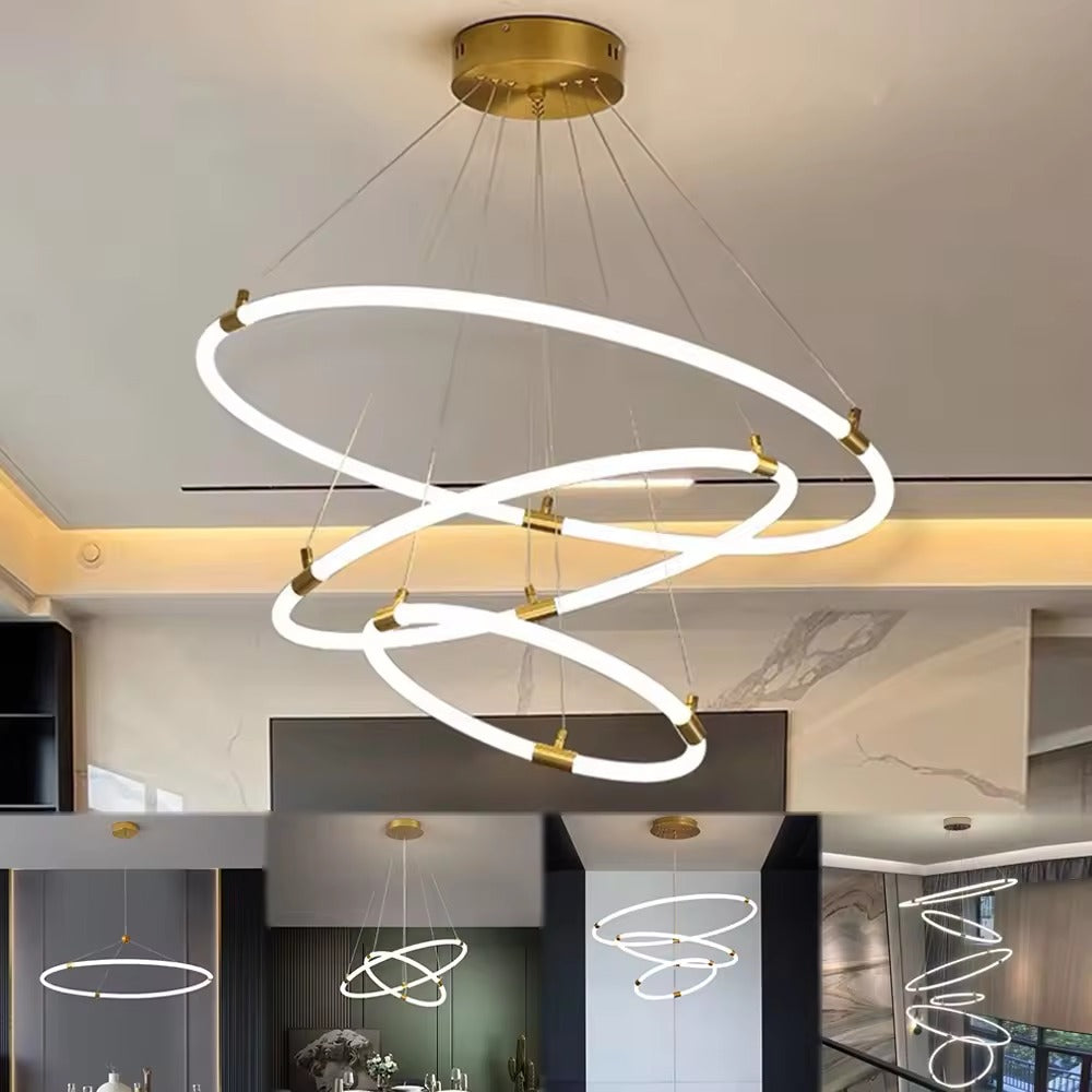 إضافةً إلى ذلك، تم تصميم النجفة بثلاثة أطواق بمقاسات مختلفة، مما يضيف تنوعاً وجمالاً في التصميم ويمكن تعديلها لتناسب ارتفاعات مختلفة حسب الحاجة. هذا التصميم المتدرج يجعل منها قطعة فنية مذهلة تجذب الأنظار وتعكس جمالاً في التفاصيل.